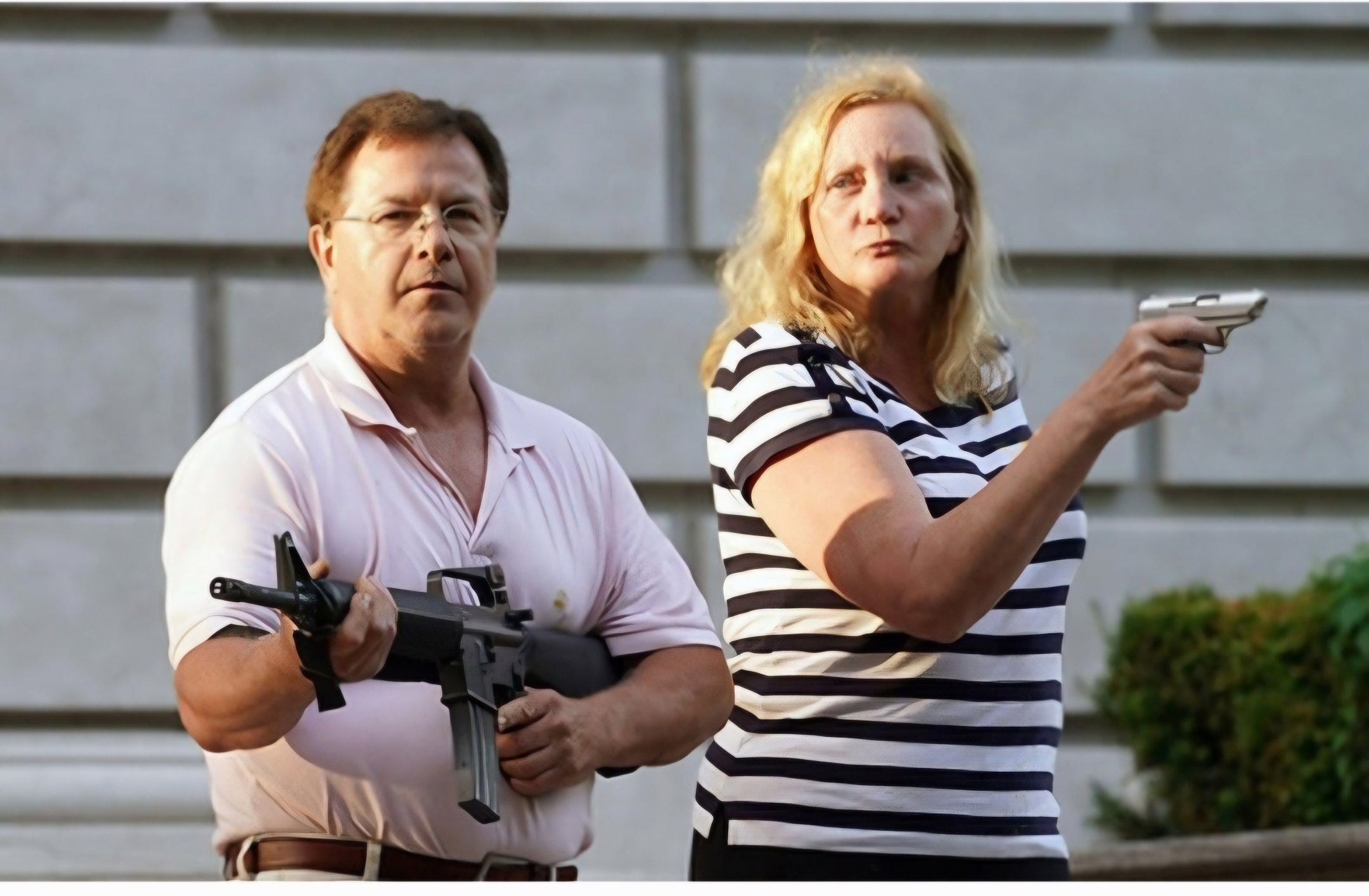 In 2020, during the height of the Black Lives Matter riots, McCloskey and his wife saw an angry group of rioters coming towards their neighborhood. After the mob tore down an iron gate and poured onto their gated street, the couple armed themselves and stood outside their property, warning the trespassers to leave.
